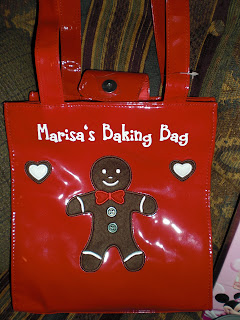 I got this cute, red, gingerbread vinyl purse from Kmart. Purses were 40% off that day! Yipee, what a deal! I had my daughter do the lettering with her Cricut machine and white vinyl and we added “Marisa’s Baking Bag” so she can keep all her whisks and “tools of the trade” together. I also found a darling tiny mixing bowl like my favorite ones I use with the rubber bottoms that don’t slide around, from Target. I had never seen this small size before but it will be perfect for her little 31/2 year old hands. All the other girls at preschool will be so jealous!