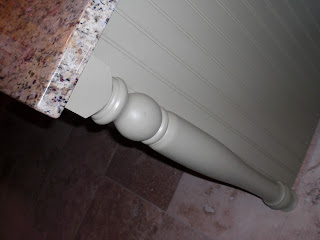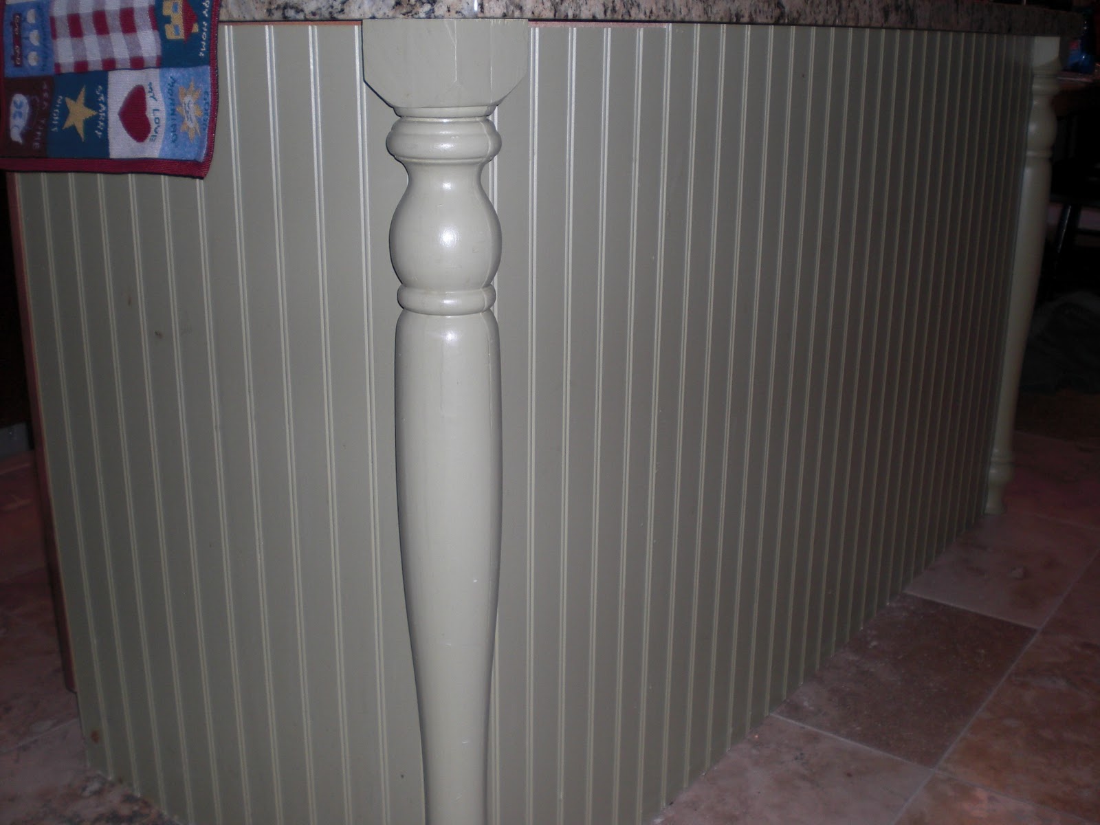 It was looking like it would work to just hook the legs onto each 90 degree angle of the island back corners, but both legs were too short to reach the granite top. So we went back to Lowes and looked for some kind of decortive block to add to the top. John then cut a 1/4 slot out of each of the block sides (tricky to do) and glued them to the tops of the legs.  He added on the legs to the 2 corners, gluing them to the beadboard edges with Liquid Nails. That’s the stuff that comes in a long tube with a glue bottle point on one end and you shoot it from a gun. That stuff is miracle goop!  Then I picked out Glidden (my favorite paint) in eggshell finish and painted everything a light sage green. You can kinda see the seam from the glue together in this close up pic, but nobody else notices things like that. The legs ended up costing us less than $20 bucks! How’s that for custom?
