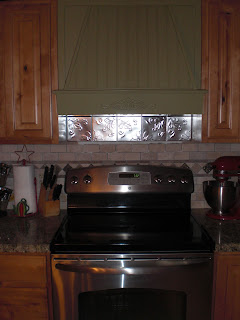 Then I painted it sage green to match the beadboard island. Both of them turned out really pretty. We put up the tin tiles above the backsplash that go all the way up the wall under the hood. Pretty!  I still have to get some lights under that vent. It’s not bright enough when I’m cooking in the kitchen. Lights are still a to-do item.  3 cheers for do it yourselfers!!! The last 3 projects coming up…