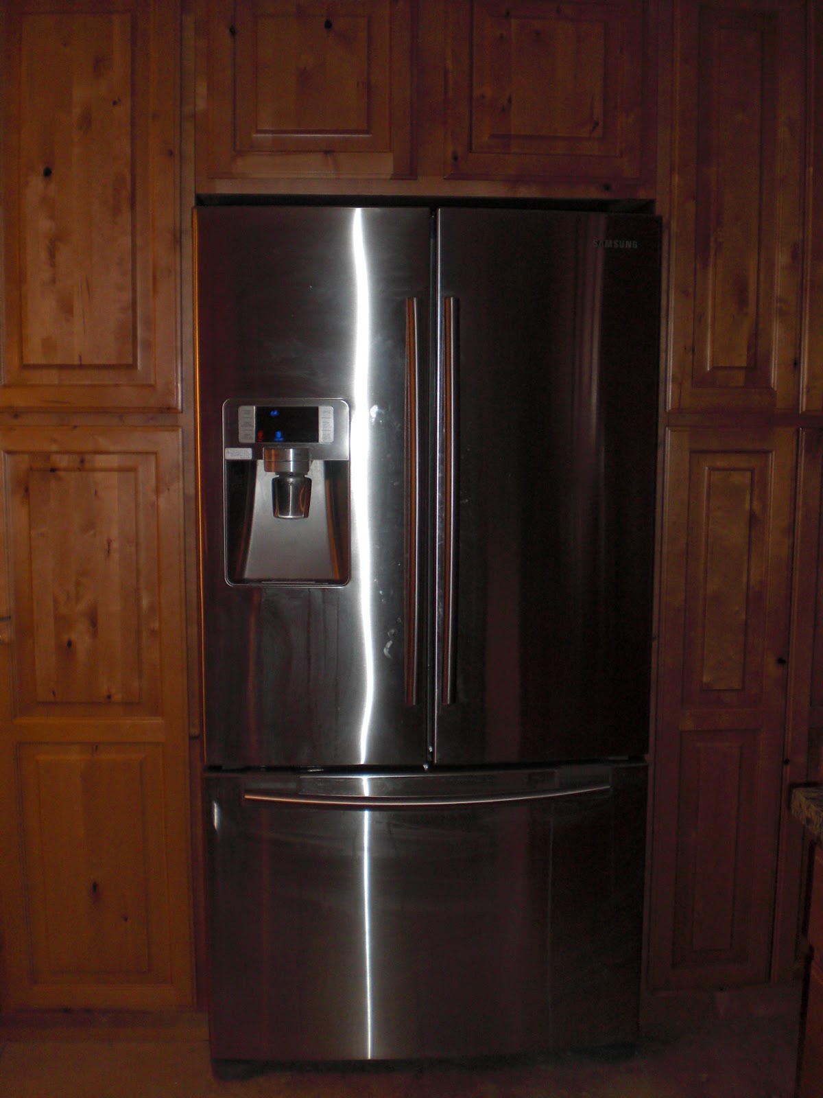 | Counter depth fridge…wish it was bigger…but I LOVE the pantry cabinets we installed all around and above it! SPACE!!! |