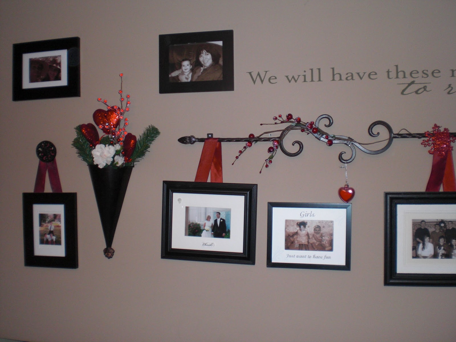 Anyway, Rodworks has lots of great ideas and will help you figure out what you need to decorate any large or long wall in your house. I bought this cool wrought iron decorative rod there and I bought the 2 black wrought iron “cones” to use as seasonal flower holders. I change them up from Christmas greenery and holly berries and jingle bells at Christmas to pink and yellow and pink beaded greenery at Easter to orange and brown and green fall leaf sprays and pine cones at Thanksgiving. You can see the sugared hearts I have in there for Valentines now. It is fun to change the ribbon colors occasionally too. They are only up there as decoration. They are just stuck to the back of the frames with double stick tape. The medallions in black wrought iron on the left and right at the bottom (covered with a ribbon) are also from Rodworks. All of the wrought iron probably cost me about $40.00. I think I had some coupons too.