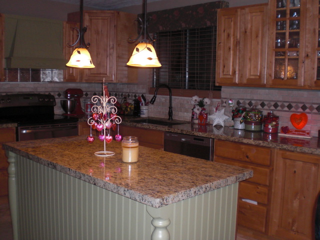 The next thing we decided on was travertine floors. They are hard and cold in the mornings and anything you drop on them is instantly going to shatter, (trust me on that, and I mean SHATTER!!) but I still love them. I love floors that hide dirt and travertine is the master at that, with all the natural blotchiness it comes in. They match any decor and they look very beautiful even when they haven’t been washed in weeks. When I do vacuum and clean and polish the travertine floors  they just shine like brand new. The travertine floor tiles were one thing we both completely agreed upon. We were both willing to spend the extra money on travertine too. We bought it at Home Depot and had it professionally installed.  I think it will be a good resale value item that won’t go out of style. Maybe the knotty birch cabinet may looked dated in a few years, but not the granite nor the travertine floor tile.