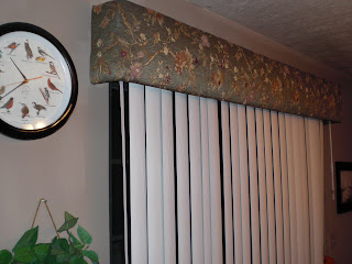 I think the last thing we did in the Kitchen Remodel was the window treatments. We learned how to make a Fabric Window Cornice. We really wanted to replace the old metal sliding glass door and put in a beautiful wooden one with those neato shades that are on the inside you just pull a switch and they appear and block out the view. But we were paying for a wedding this same summer we remodeled so that has been put on the backburner for now. Maybe next summer when we are planning on redoing the backyard decking and adding a jacuzzi, that would be the time to add the glass door. Anyway, we decided that a nice thing to do for now would be a handmade window cornice for up above the wood blinds and vertical blinds.