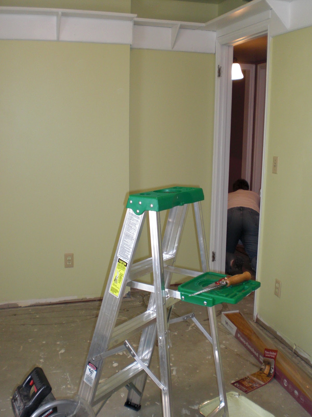 | Here are kinda “Before” pictures..I’d already painted walls….John is laying the wood flooring in the hallway… |