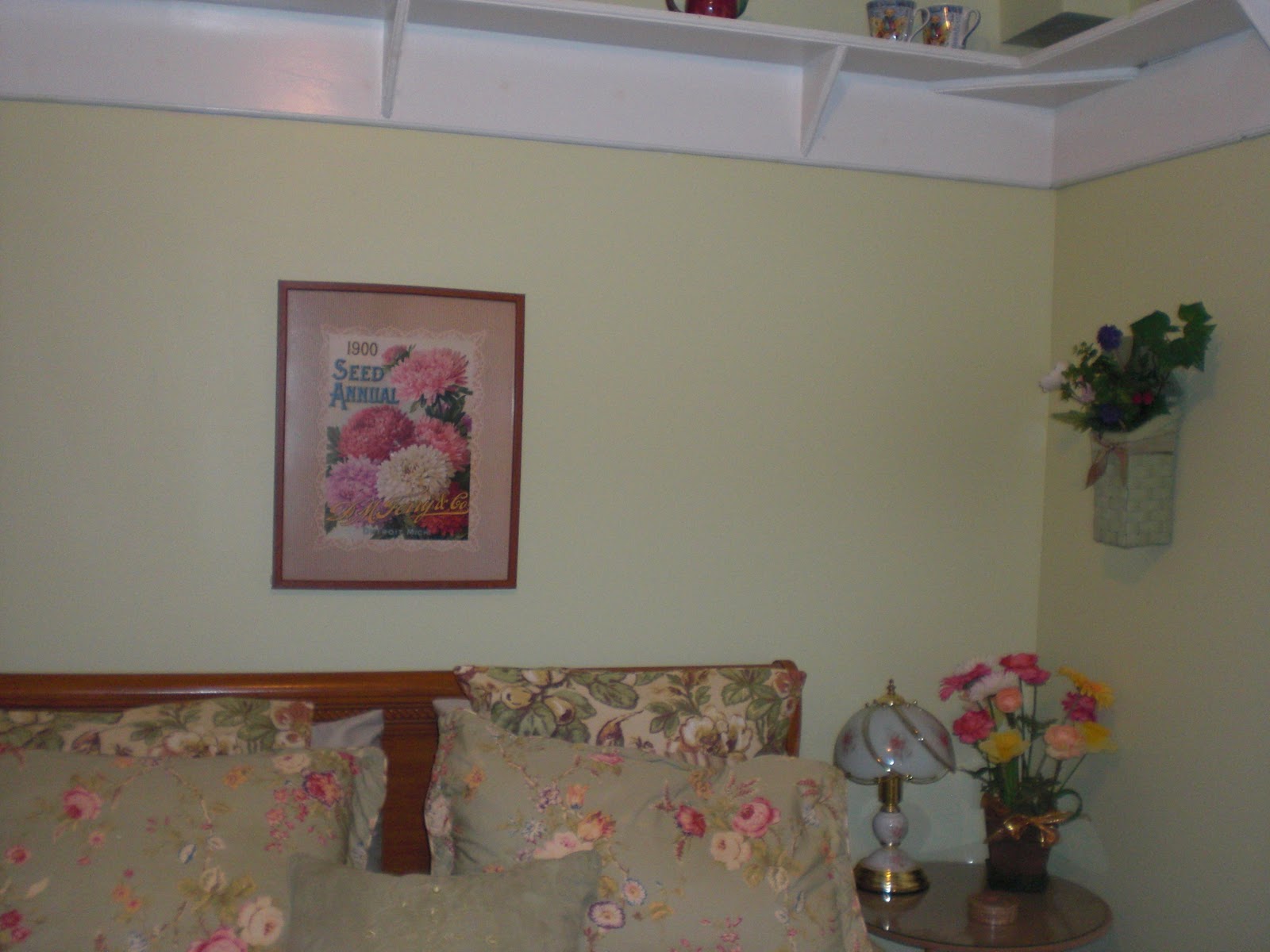 I went over to Roberts Crafts and last Spring they had all these birdy themed things going on. I bought this light green, wrought iron shelf for $8 bucks on clearance, and put the birdhouses on it that wouldn’t fit around the white ceiling shelf. Then I went looking for art and I found a few bird prints from T.J. Maxx with green & white mattes! Yipee! What a streak of luck!.