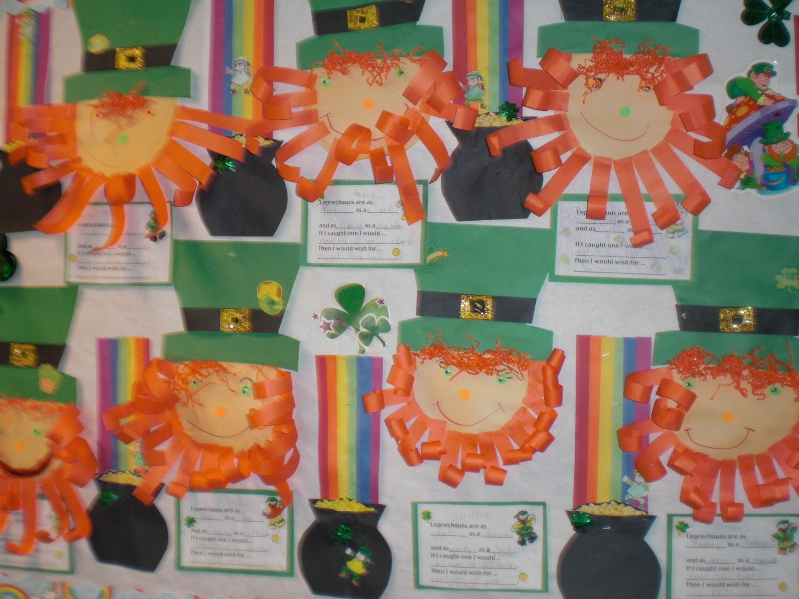 For fun we do some leprechaun alliterations and similes. I teach them what a simile is (A leprechaun is as tricky as a fox and as tiny as a mouse, etc), and they try to come up with their own. They are usually very hysterical, way crazy or just funny. Then we play Simon says, Simon being an Irish little leprechaun, and if you can do what he says, you can take his place.