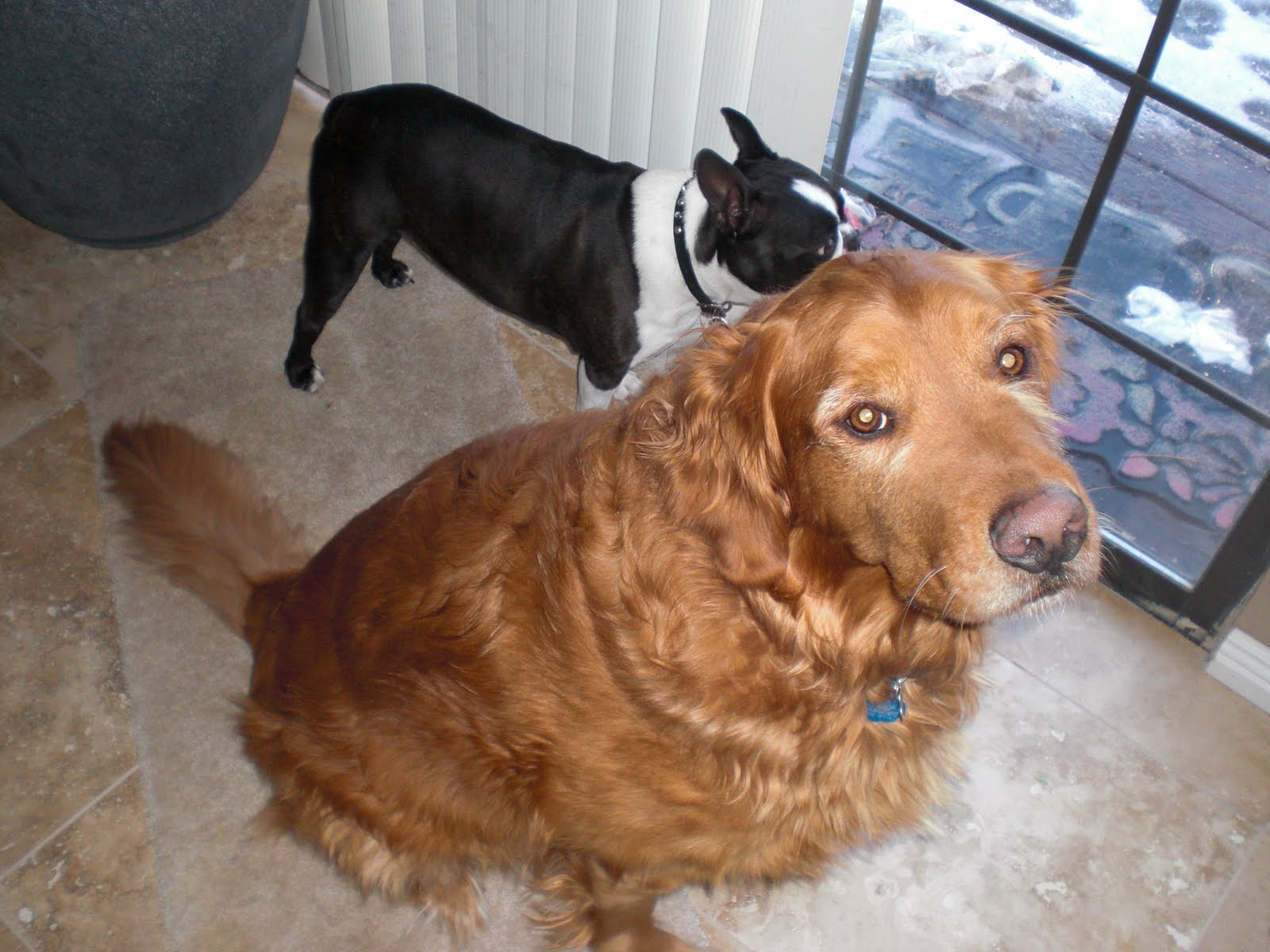 So when I got home from work there big old Gunner was. And I gave him a big old hug and was fluffing up his fur with a little bit of scratching and my husband says, “Oh, No…. you better watch out, Bruce is gonna get so jealous!” And just then Bruce comes jumping up wildly on me like “hey man, don’t pet that big guy, pay no attention to HIM,  I’m the kingpin around here!” OMGosh I’m thinking, I have a JEALOUS DOG! How did that happen? hmmm