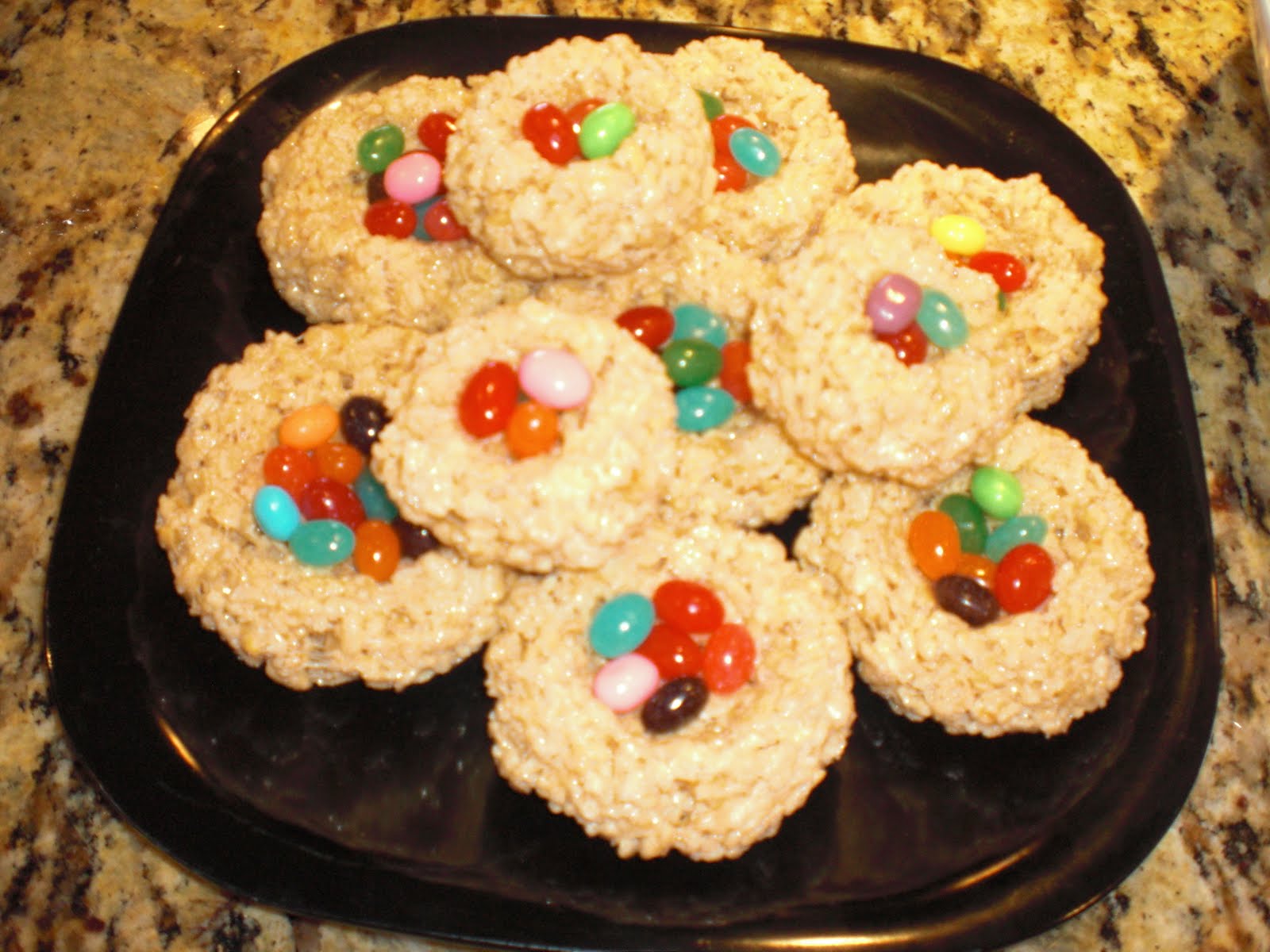 | Devin’s rice crispy bird nests with Starburst and Jolly Rancher jelly beans….Guy Food… |