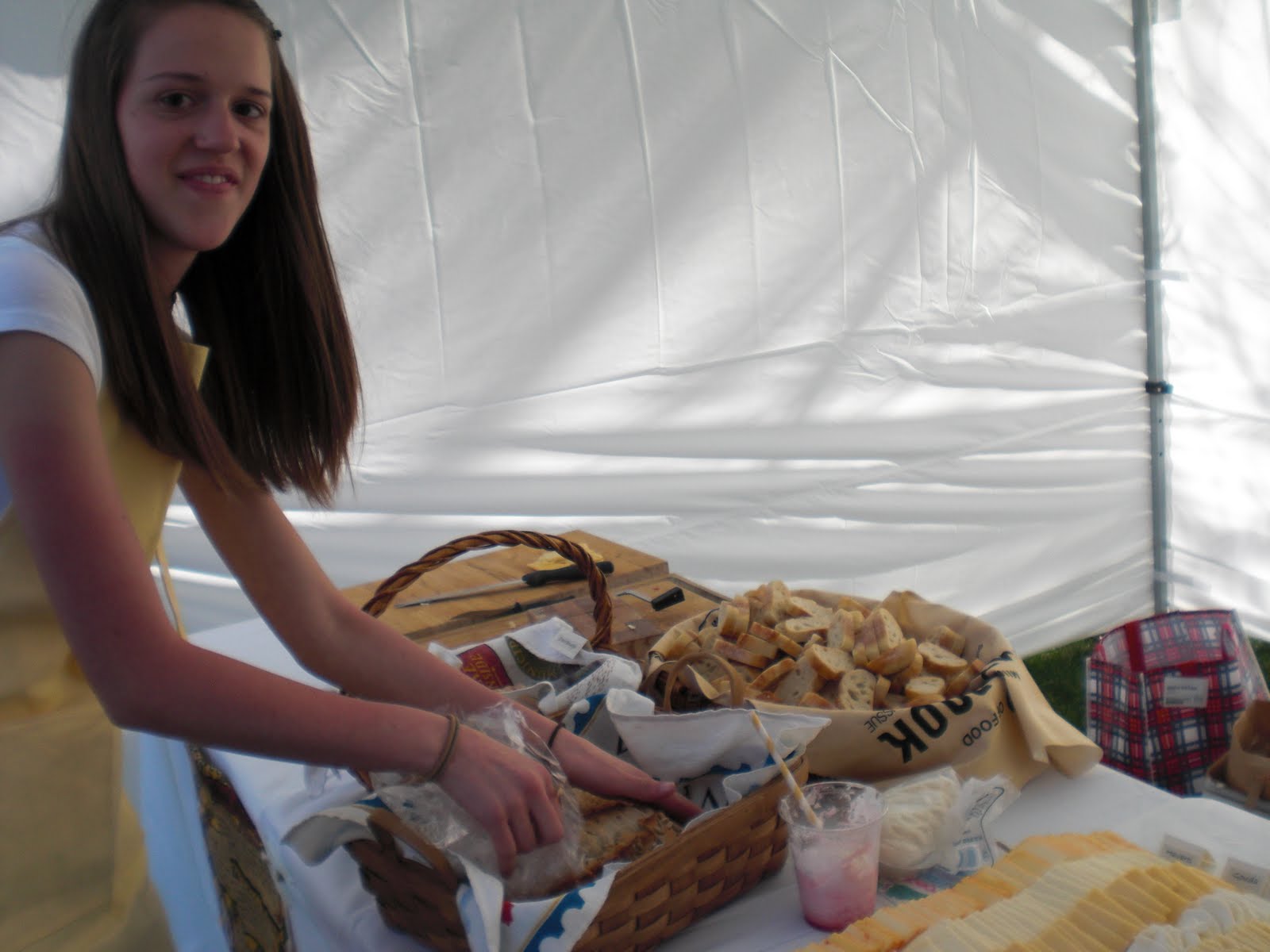 We were hungry so we walked over to see what was cooking. They had Randy Haycock and his son Tanner doing the BBQ and they had all kinds of fish and chicken on kabobs with all kinds of zesty sauces to try. Oh my everything there was superb!  Then we walked next door to the bread and cheese booth. I had never tasted fresh mozzarella before and I chose some nutty bread to spread it on. They also had hot artichoke dip in a fry pan. Oh heavens was that ever good! The girls in charge did  a beautiful job.