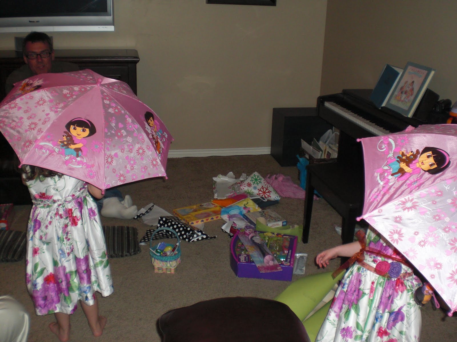 I always find a really good deal on baby clothes on the clearance rack, especially after a holiday. I can get them the same shirt in 3 sizes for my 3 granddaughters the days after Halloween or Easter and then the following year give that for a gift in the correct size. Kmart has deals too on jammies, dresses and things like purses and hats and umbrellas. I got these matching Dora umbrellas after the rainy season a year ahead for just a few bucks and then gave them as Easter gifts the following year. I think they were $2.00 each. The Easter dresses from T.J. Max were $5.00.