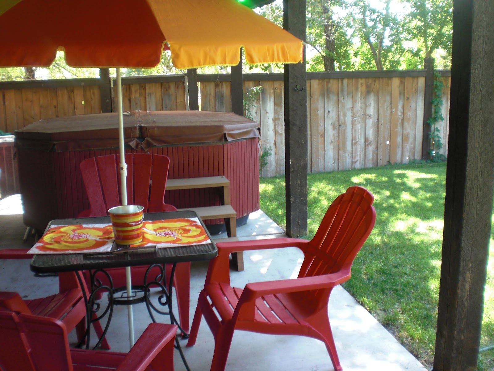 | At Lowes these adirondack chairs were $10 bucks at summer’s end and the umbrella from Kmart was only $9.00. The placemats, candle and an outdoor pillow from Walmart were very inexpensive too. |