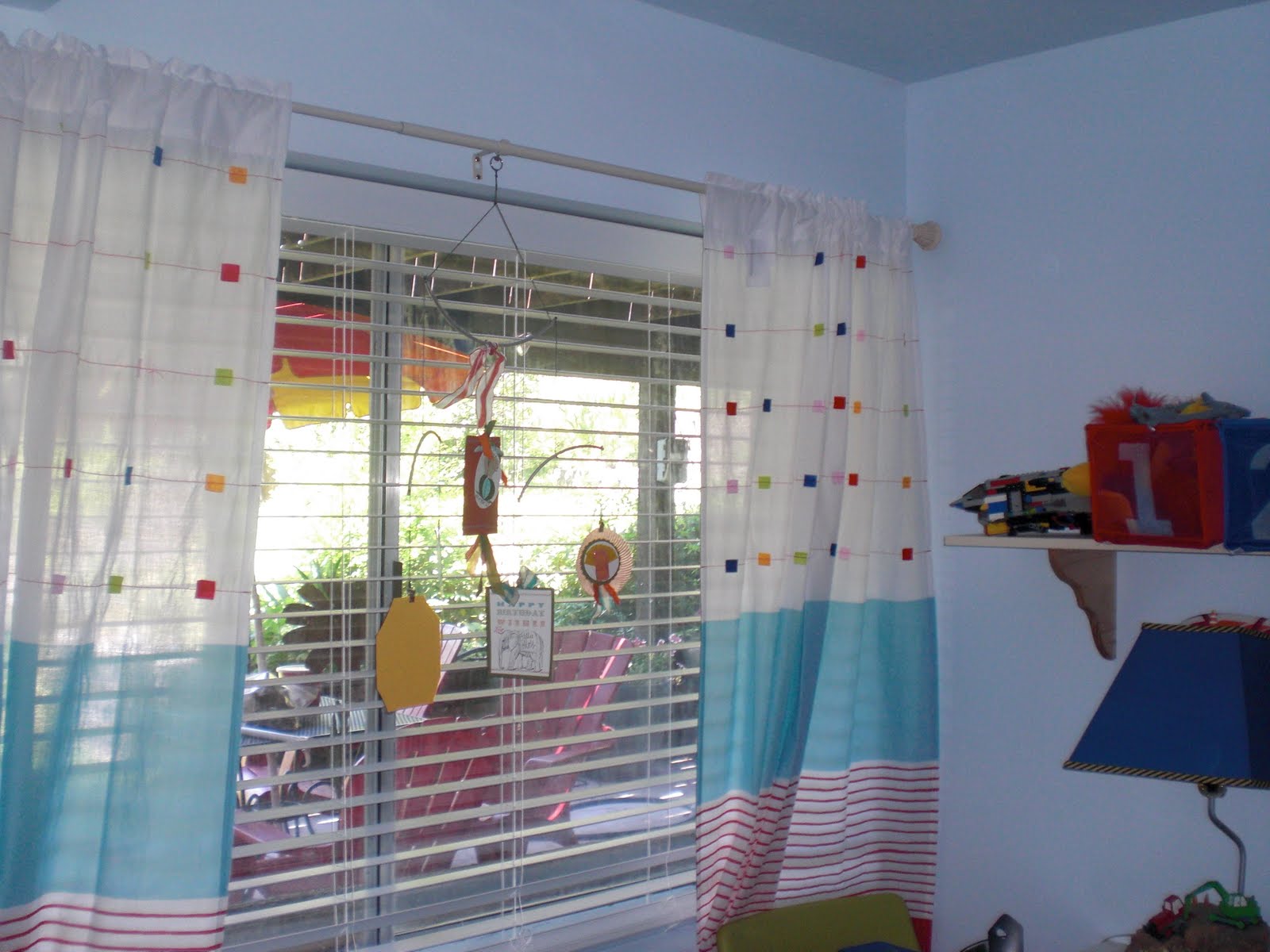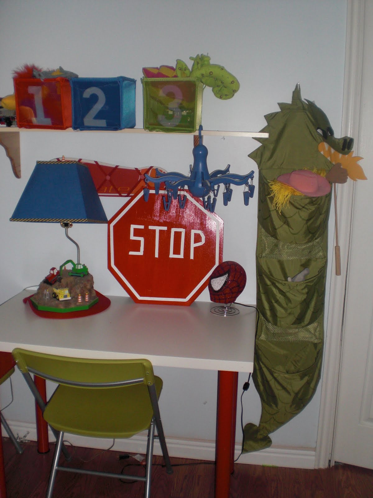 | I got the table for $5.00 at Ikea, regular $20. the chairs for $9.00 at Target. We use them for extra seating at holiday dinners. I made the cute Stop sign out of scrap chalkboard wood. |