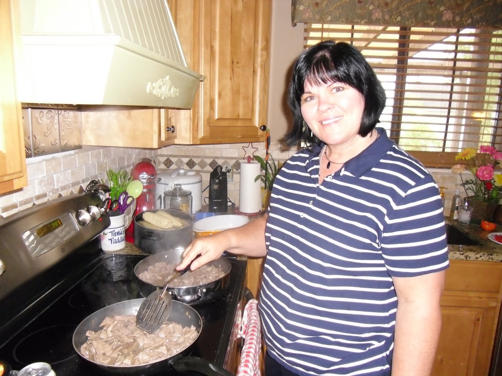 | Here I am in my kitchen frying up the thin sliced steak pieces…. |
