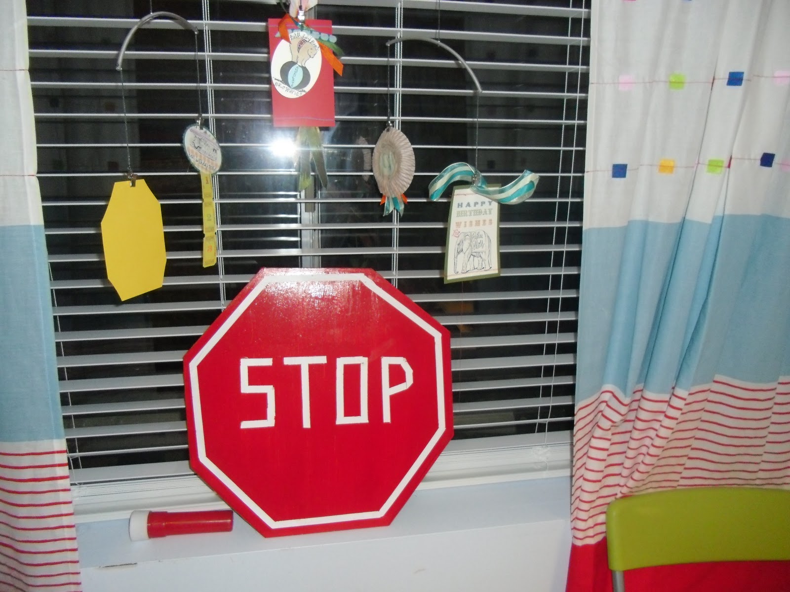The lamp was from Pottery Barn originally, but I got it for $25 bucks at Down Home East, which is a clearance house for Pottery Barn. It is darling. I made the stop sign myself out of some scrap lumber.