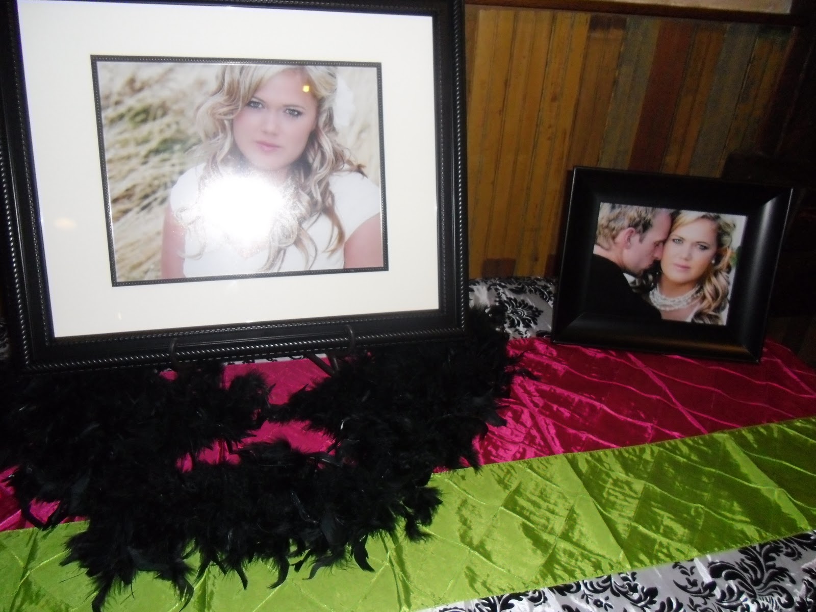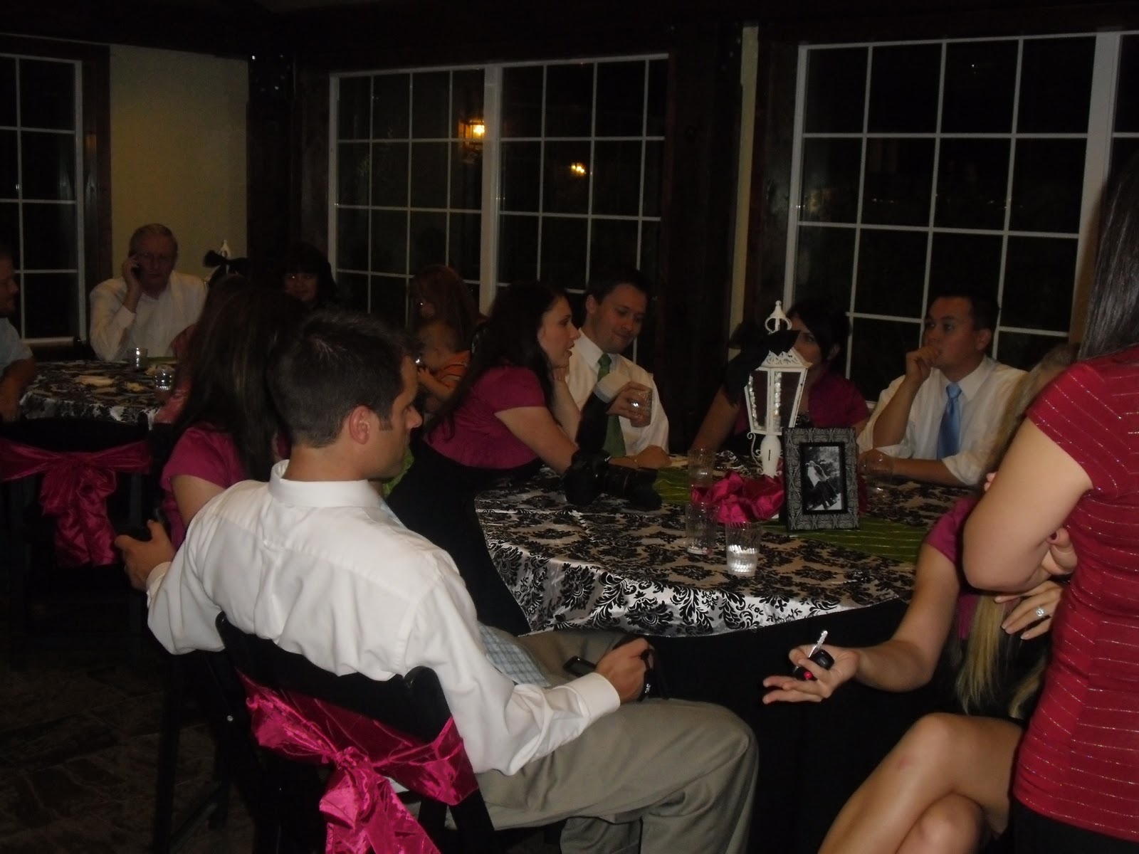 The tables had black and white with florals, photographs and little hurricane lamps…