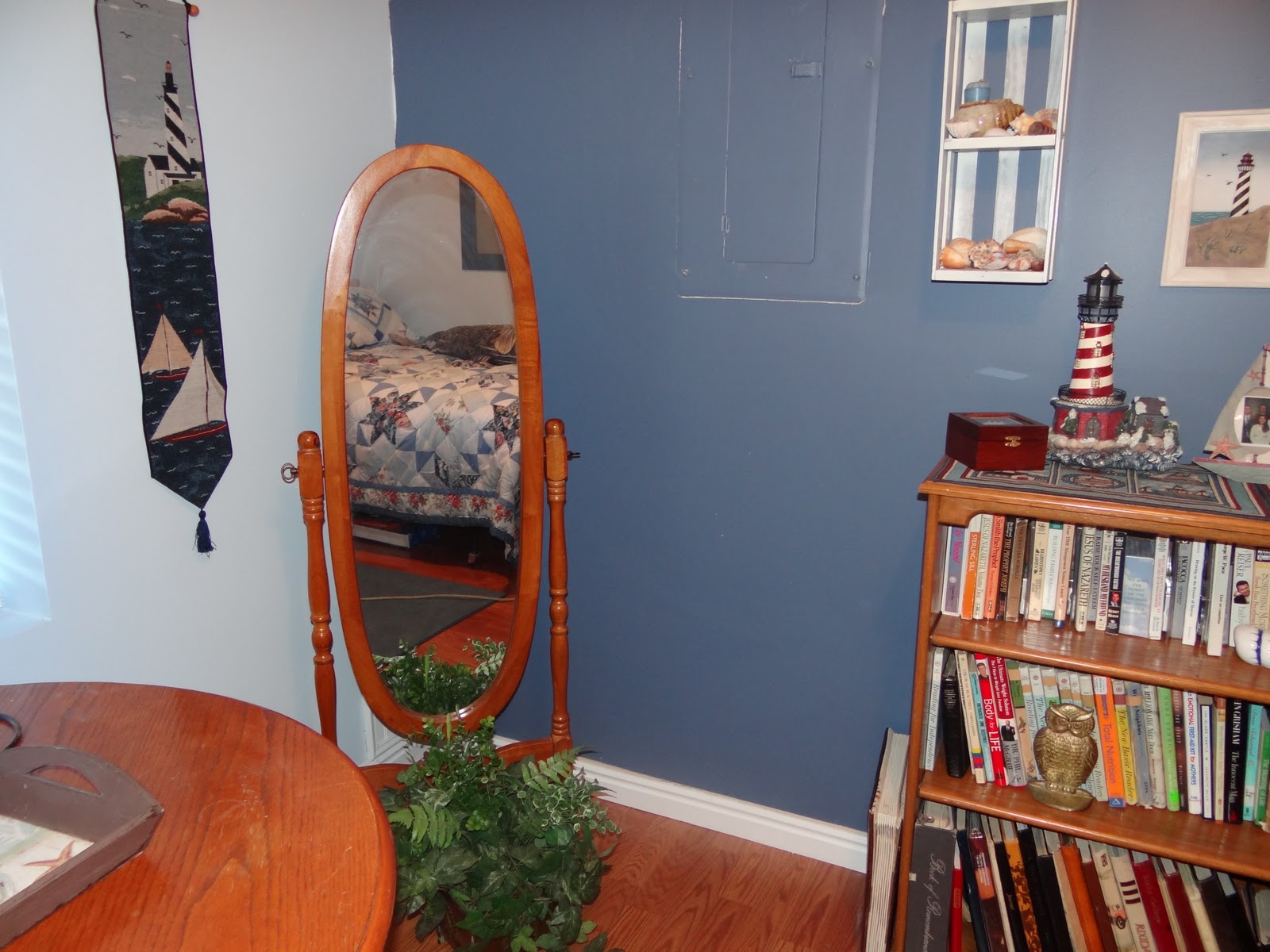 | Here’s the bookcase and the dark blue wall decor……I found lots of lighthouses……So pretty! |