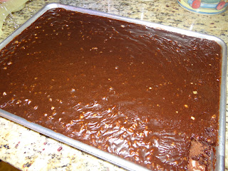 | Texas Sheet Cake for dessert…..done by cute Caitlin and Devin…the newleyweds… See that little piece missing? I did that…..no will power at all….sigh…. |