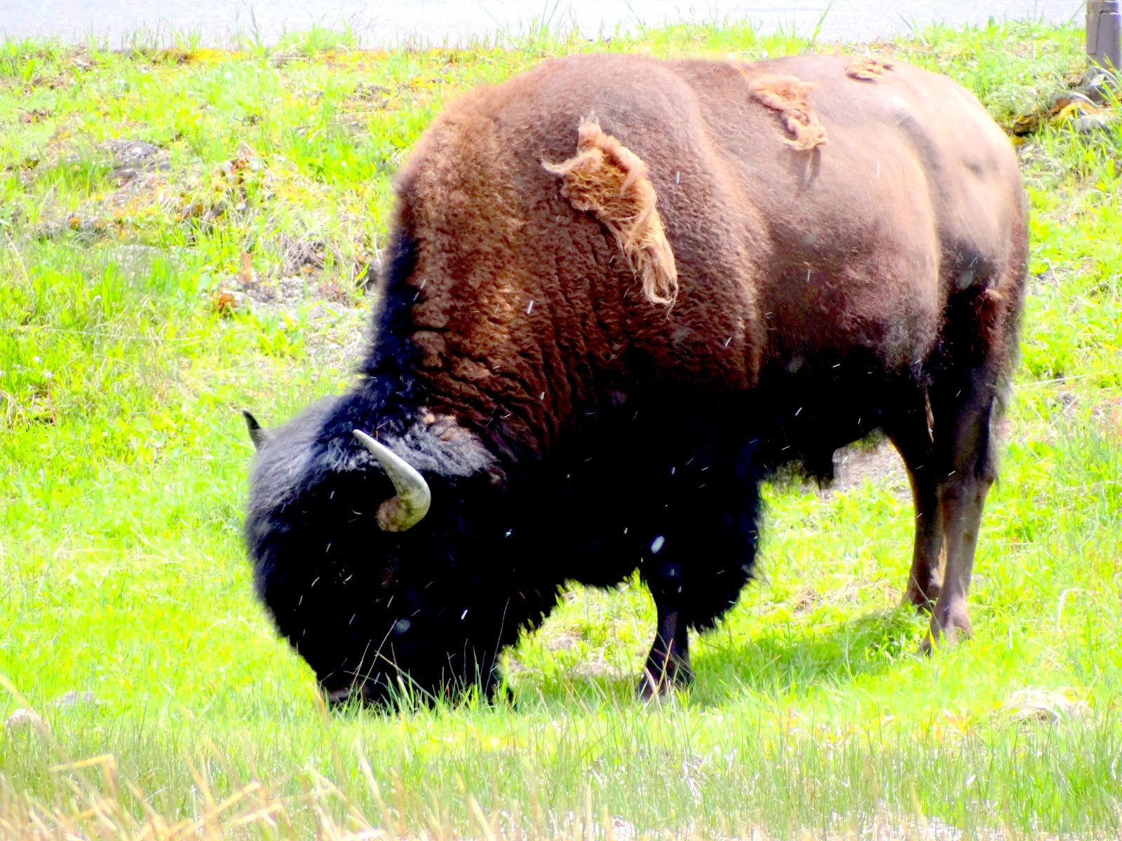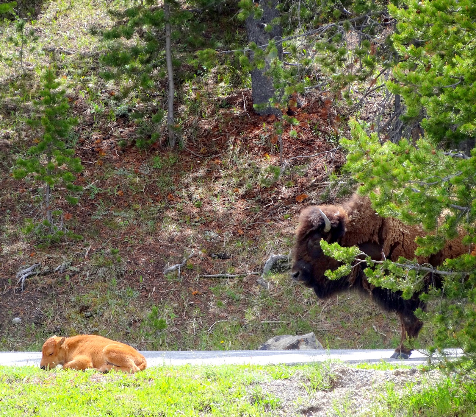 | As we roamed around the loop at Yellowstone looking at all the places to see, hot pots, geysers, waterfalls, we kept running into these buffalo…Here is a mama and a brand new baby right at the side of the road!! The scary looking dad was not far off at all! |