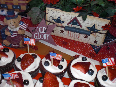 I liked the red licorice striped cupcakes with the little candy blue balls. I have some peel apart red licorice so I will try that one too. And maybe I can come up with some little picks in a patriotic theme.