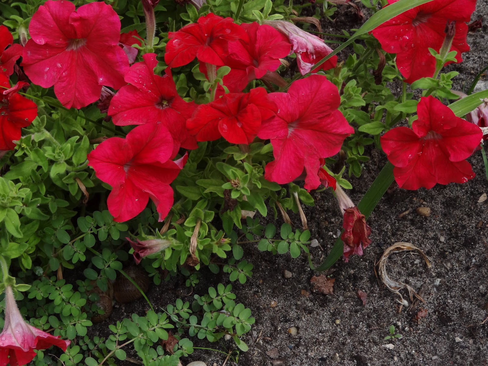 | In front of each mugo pine I places some annuals in different colors. It’s been so HOT though that they didn’t spread out as much as I’d have liked. |
