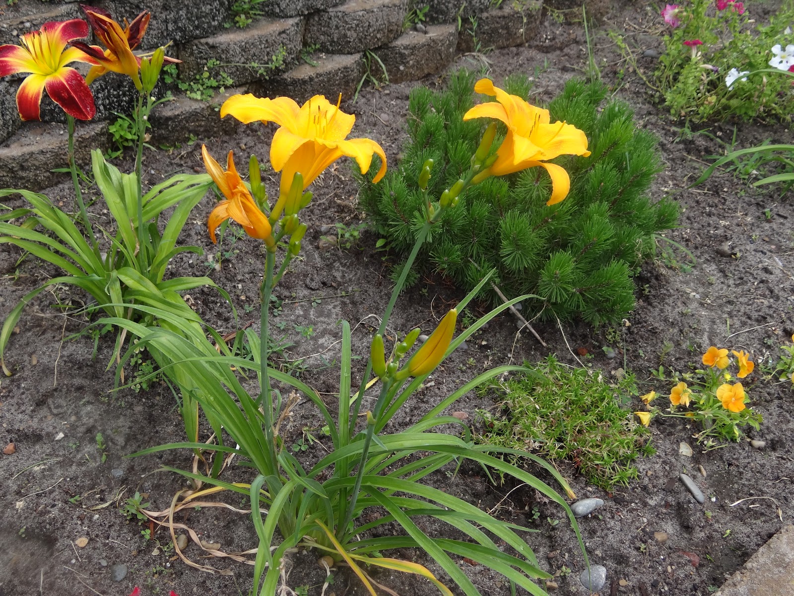| My mugo pines and lilly garden. I alternated 2 lillies and a mugo pine all across last year. So this year they are just coming up. Hopefully they will grow into green mounds over the next year. |