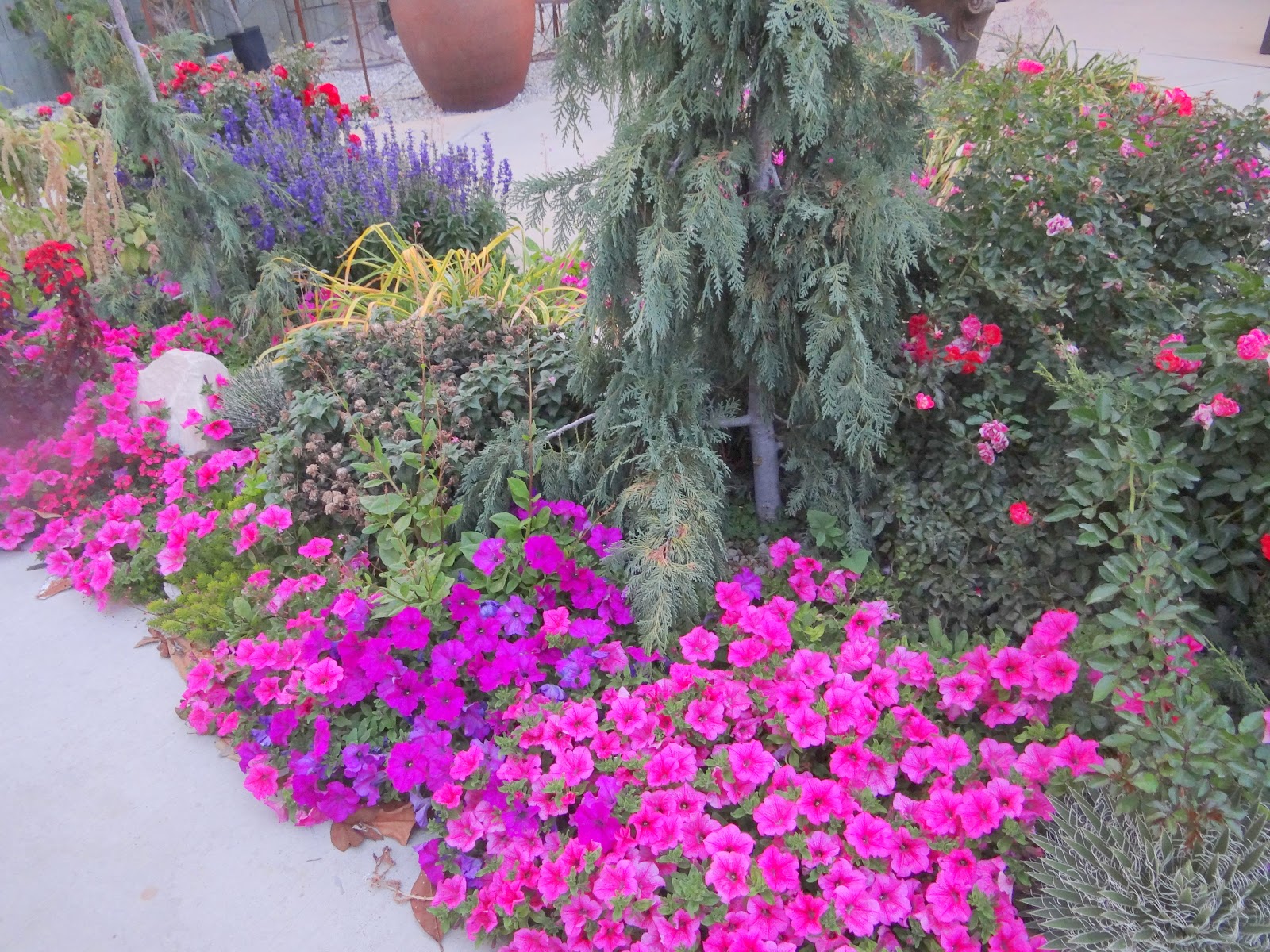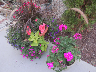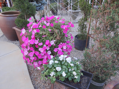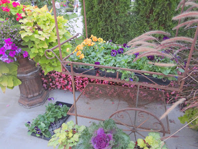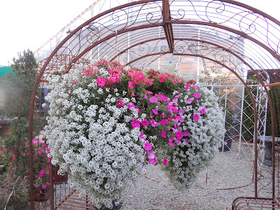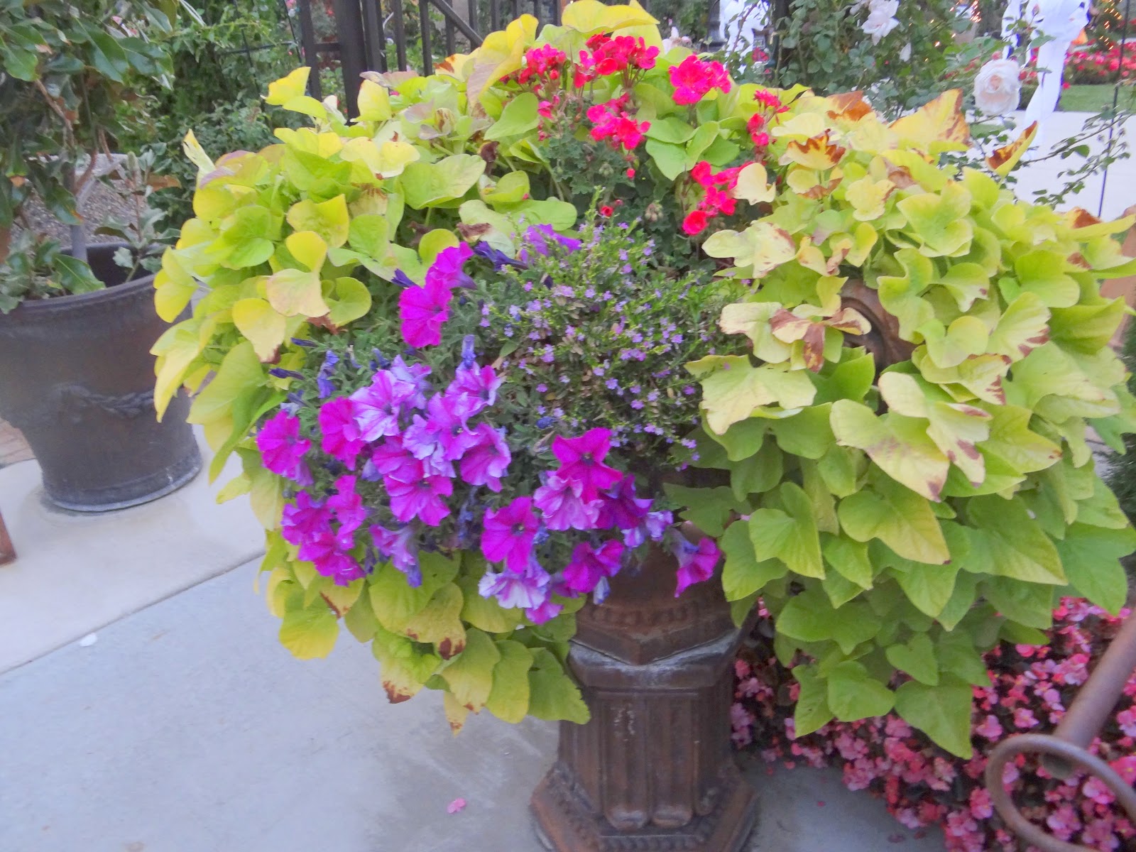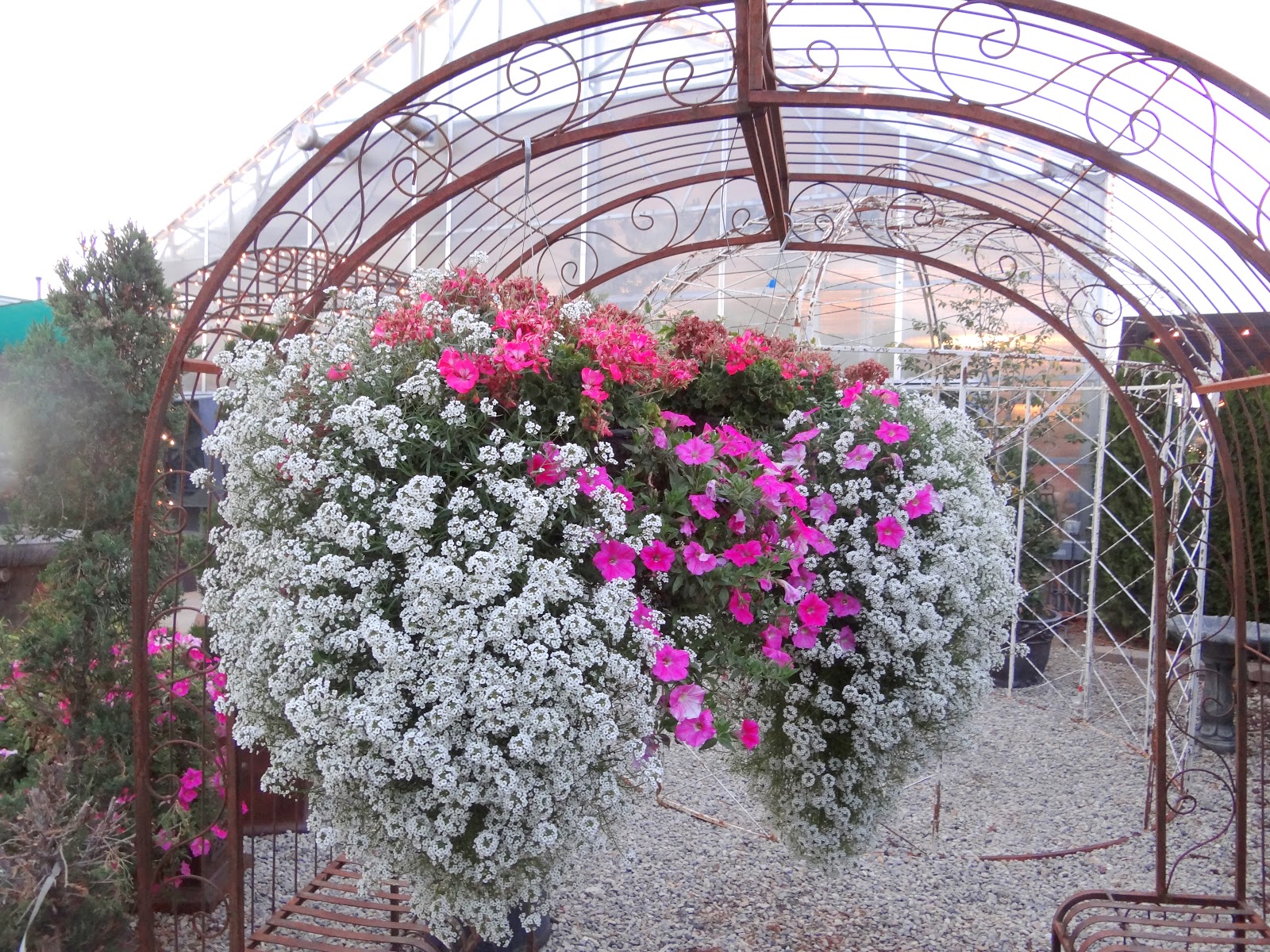 I loved this wrought iron arbor with hanging baskets of piled up flowers…..