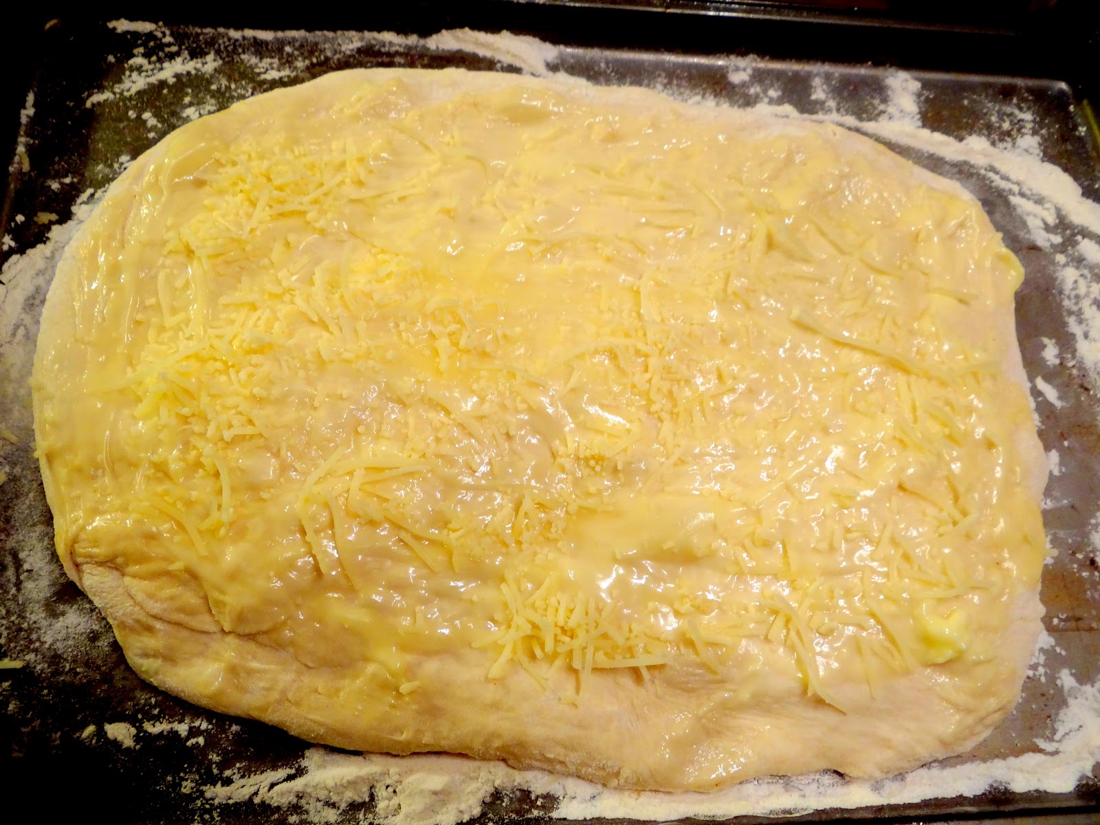 3. Place on greased cookie sheets in 6 inch rolls or use a pizza cutter to cut them into strips. Use silicone brush to lightly brush melted butter on top of each bread stick.
