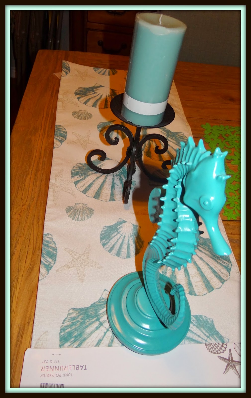 | I got this candle and this cute seahorse to add to the great room. I love the colors. They are all beachy turquoise blue. |